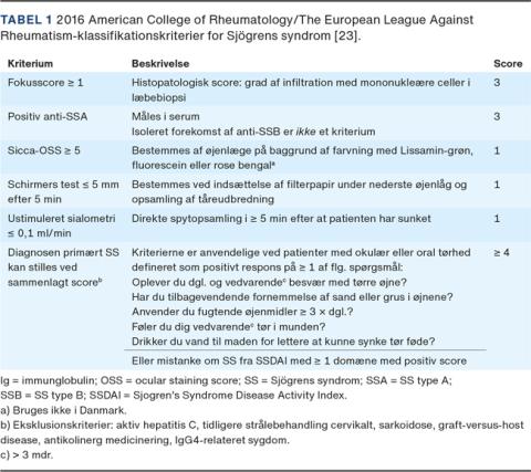 Der findes ingen diagnostiske kriterier for SS. I diagnostisk øjemed bruges ofte klassifikationskriterierne fra American College of Rheumatology (ACR) og The European League Against Rheumatism (EULAR) (Tabel 1) [22]. Det understreges, at patienterne kan have SS uden at opfylde klassifikationskriterierne. Der er altså tale om en klinisk diagnose hos patienter med tørhedssymptomer og autoimmunitet. Patienter, hos hvem man har mistanke om SS, skal henvises til reumatologisk udredning og risikostratificering. I det følgende klarlægges, hvilke anamnestiske, objektive og parakliniske forhold, som kan belyses i almen praksis inden henvisning. Se i øvrigt Figur 1 med flow chart over et typisk forløb.