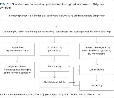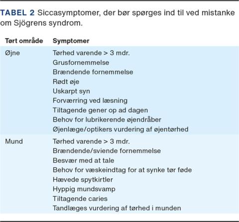 Sjögrens syndrom (SS) er en systemisk, autoimmun bindevævssygdom, der kan påvirke alle kroppens organer. Sygdommen manifesterer sig primært ved tørhed i øjne og mund (siccasymptomer), udtalt træthed og muskuloskeletale smerter. I sjældnere tilfælde findes organinvolvering og neuropatier. Patienterne har en øget risiko for udvikling af lymfom [1]. Hos 50-70% af patienterne ses forhøjet niveau af anti-Sjögrens syndrom type A (SSA)-antistoffer i blodet [2]. Syndromet forekommer i en primær form (pSS) uden anden autoimmun sygdom og en sekundær form i forbindelse med andre autoimmune sygdomme, ofte reumatoid artritis eller systemisk lupus erythematosus [3, 4]. pSS er en hyppig autoimmun sygdom, men pga. det heterogene symptombillede er den ofte både fejl- og underdiagnosticeret [5-7]. Prævalensen antages at være 1%, svarende til 50.000 danskere, heraf er halvdelen af tilfældene pSS [8]. Som ved mange andre autoimmune systemsygdomme er de fleste af patienterne kvinder; mand-kvinde-ratioen er 1:9. pSS debuterer oftest i 30-50-årsalderen, men debuten kan ske i alle aldersgrupper [9]. Med denne artikel ønsker vi at udbrede den nyeste viden om SS og klarlægge, hvornår mistanke om SS skal opstå, og hvilke patienter der bør følges af en privatpraktiserende speciallæge i reumatologi eller på en reumatologisk afdeling.