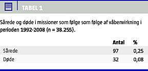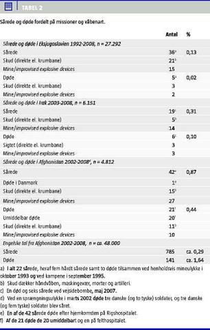 I perioden 1992-2008 har Danmark haft en mortalitet på 0,08% i missionerne og en morbiditet på 0,25% som følge af våbenvirkning (Tabel 1 ). Tabel 2 viser mortaliteten og morbiditeten fordelt på de tre store indsættelsesområder. Der bemærkes, at morbiditet og mortalitet er stigende.