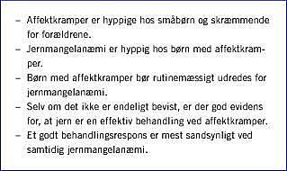 Konklusion: Der er god evidens for, at jernmangelanæmi hos børn med affektkramper disponerer for disse. Klassifikationen af den videnskabelige evidens er vanskelig.