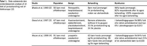I tre arbejder belyses spørgsmålet (Tabel 1) [2-4]. Bhatia et al [2] undersøgte 50 børn med affektkramper og 50 kontrolbørn. Undersøgelsen har svagheder. Man savner randomisering, inklusions- og eksklusionskriterier, definition af jernmangel-anæmi og effektparametre. Behandlingseffekten beskrives som »fald i voldsomhed eller frekvens af anfald« uden nærmere definition. Det er uklart, hvor mange af børnene der havde jernmangel, da ikke alle fik taget blodprøver med henblik på undersøgelse herfor. Arbejdet [2] giver, trods svagheder, en vis evidens (evidens 3, styrke C) for værdien af jernbehandling.