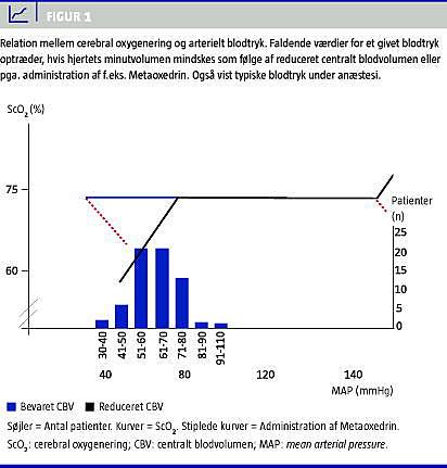 Fra et anæstesiologisk synspunkt er denne model for regulation af CBF en udfordring. For at reducere det operative blodtab kan kirurgi gennemføres under såkaldt hypotensionsanæstesi, og blodtrykket er da markant lavere end det, der angives som den nedre grænse for cerebral autoregulation (Figur 1). Omvendt kan sympatisk stimulation med f.eks. administration af noradrenalin [4] eller Metaoxedrin øge blodtrykket til højere tryk end angivet som den øvre grænse for cerebral autoregulation, men der etableres da et fald og ikke den forventede stigning i ScO2 .