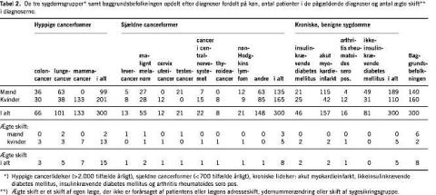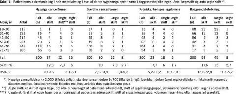 Anvendes skiftefrevensen i baggrundsbefolkningen som reference var odds-ratio (OR) for skift 1,40 (95%: 0,50-3,93); 1,05 (0,41-2,72) og 0,57 (0,21-1,54), i de anførte tre grupper efter stratificering for alder (under/over 50 år) og køn. Flest skift fandtes i aldersgruppen over 50 år blandt patienter med hyppige cancerformer, hvor der var i alt 14 skift blandt 240 patienter (5,8%).