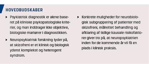 De senere års neuropsykiatriske forskning tyder på, at skizofreni er et klinisk såvel som biologisk yderst komplekst og heterogent syndrom. Perspektiverne i subgruppering, målrettet behandling og afklaring af tidlige kausale risikofaktorer giver tro på, at den omfattende neuropsykiatriske viden i de kommende år vil blive omsat til klinisk psykiatrisk praksis til direkte gavn for patienterne med skizofreni.