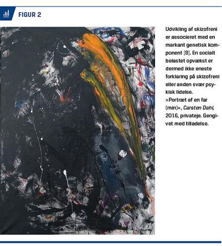En tidlig debutalder og en lang ubehandlet psykose peger på et andet central element i udviklingen af psykose. Anamnestisk er der yderst sjældent tale om et binært »før og efter psykose«, men typisk er der tale om en mangeårig snigende debut med vage og ukarakteristiske adfærdsforstyrrelser, kognitive vanskeligheder og sociale problemer. Der kan påvises strukturelle afvigelser i hjernens ledningsbaner hos personer, der har høj risiko for at få psykose, og disse forandringer synes at hænge sammen med den diskrete, subpsykotiske symptomatologi og faldet i funktionsniveau [7]. Der er solid evidens for, at sårbarheden over for at få skizofreni eller anden alvorlig psykopatologi er associeret med en markant arvelighed, en såkaldt heritabilitet på 79% [8]. Således kan tidligere fremherskende socialkonstruktivistiske antagelser om, at skizofreni blot er »en sund reaktion på et sygt samfund« som formuleret af Ronald D. Laing (1927-1989), klart tilbagevises (Figur 2). Den præcise genetik bag skizofreni har imidlertid vist sig at være yderst kompleks, hvilket er foreneligt med den pleomorfe kliniske præsentation [9].