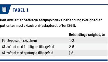 Tidligere har man opfattet skizofreni som en kronisk og livslang tilstand, og de kliniske retningslinjer for behandlingsvarigheden afspejler i en vis udstrækning denne antagelse (Tabel 1) [26]. Nyere undersøgelser tyder imidlertid på, at op mod 20-30% af førsteepisodepatienterne klarer sig helt uden medicin efter ti år [27, 28]. Randomiseret undersøgelse af muligheden for identifikation af patienter, der kan profitere af dosisreduktion eller seponering, er påbegyndt [29], men stor varsomhed er påkrævet, da de fleste af patienterne fortsat behøver antipsykotisk behandling efter ti år.