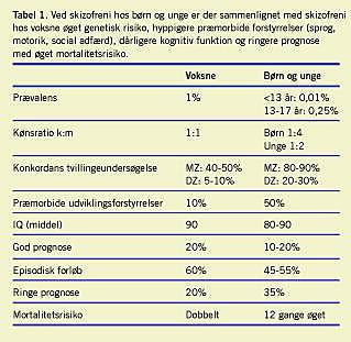 Tidligt debuterende skizofreni har en særlig kort latenstid mellem den formodede primære perinatale udviklingsdefekt og det manifeste skizofrene sygdomsbillede. Det er uafklaret hvorledes latenstiden, der almindeligvis »udskyder« debut af psykotiske symptomer indtil tidlig voksenalder, styres. Ved SBU er latenstiden formentlig kortere pga. en højere belastning af risikofaktorer eller defekte protektive faktorer (Tabel 1 ).