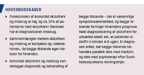 Skizofreni er et alvorlig psykiatrisk syndrom med en meget kompleks symptomsammensætning, som gennemgribende påvirker patientens måde at tænke, føle og opleve verden på, ligesom personens adfærd kan være påvirket. Livstidsrisikoen for behandlet skizofreni er ca. 2% for mænd og ca. 1,5% for kvinder [1]. Risikoen for misbrug (dvs. skadeligt brug eller afhængighed) af alkohol eller illegale stoffer er høj blandt mennesker med skizofreni eller anden alvorlig psykiatrisk lidelse. Et dansk registerstudie viste for nylig, at forekomsten af misbrugsdiagnoser hos mennesker med psykiske sygdomme var højere, end man ville forvente baseret på bl.a. Sundhedsstyrelsens tal for den generelle befolkning [2]. Således havde 37% af mennesker med skizofreni på et tidspunkt i deres liv også fået en eller flere misbrugsdiagnoser. Pga. underdiagnosticering er dette tal sandsynligvis et underestimat. Det samme er fundet i internationale studier, hvor livstidsforekomsten af skizofreni og samtidigt misbrug ligger på 36-60% [3]. Alkohol og cannabis toppede listen i det danske studie, men også opioider, sedativer og amfetaminer var relativt prævalente misbrugsstoffer. Dette mønster er ligeledes set i de internationale undersøgelser [3].