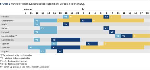 I en lang række lande har man allerede implementeret varicelvaccinen i børnevaccinationsprogrammet med signifikant reduktion i incidens, hospitalsindlæggelser og komplikationer til følge. I Italien og Ungarn er vaccinationen endog obligatorisk (Figur 2) [20]. I andre lande har man været tilbageholdende med at indføre vaccinen. Det skyldes dels opfattelsen af sygdommen som værende harmløs, dels bekymringer vedrørende negative konsekvenser på incidensen af HZ og risikoen for aldersskift. Man har imidlertid ikke kunnet påvise disse negative konsekvenser i lande, hvor vaccinen er indført.