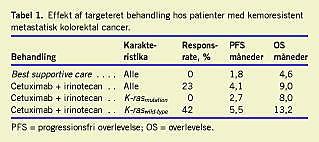 Blokering af EGFR hæmmer bl.a. den signalvej, der reguleres af K-ras. K-ras er et guanosintrifosfat (GTP)-bindende protein, som virker som en tænd-sluk-mekanisme for regulering af cellevækst. Mutation i K-ras- genet fører til, at K-ras- proteinet konstant er aktiveret uafhængigt af blokade af EGFR. Hos patienter med mKRC er K-ras- genet muteret hos 40%. K-ras- analysen kan foretages på formalinfikseret, paraffinindstøbt væv såvel fra primærtumoren som fra metastaser, da mutationen sker tidligt i karcinogenesen. Stort set alle K-ras- mutationer findes i to kodons, hvorfor en polymerasekædereaktion (PCR)-baseret undersøgelsesmetode er meget velegnet. Ak-tuelt pågår et europæisk kvalitetssikringsprogram af K-ras- analysemetoder [4]. Samtlige publicerede studier viser, at K-ras- status er en fremragende prædiktiv markør for effekt af cetuximab og panitumumab. Kombinationen af cetuximab og irinotecan [5] giver tumorsvind hos næsten halvdelen af patienter med normal K-ras, og overlevelsen forlænges fra fire til 13 måneder (Tabel 1 ).