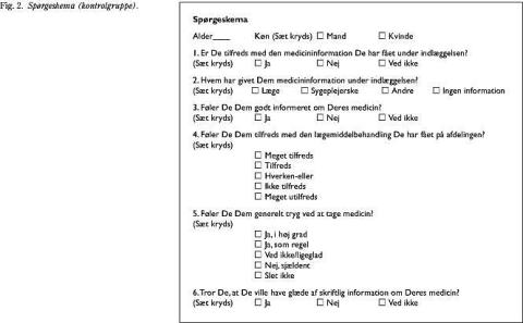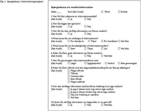 Metode: Prospektiv, ublindet kohorteundersøgelse med kontrolgruppe. Materialet bestod af konsekutivt indlagte patienter på fire afsnit på en medicinsk afdeling i perioden fra november 1999 til juli 2000. I alt indgik 78 patienter, 35 i interventionsgruppen og 43 i kontrolgruppen. Et afsnit fungerede som interventionsafsnit, tre andre som kontrolafsnit. Patienter, der var indlagt på interventionsafsnittet, fik uddelt skriftlig information om nyordineret medicin.