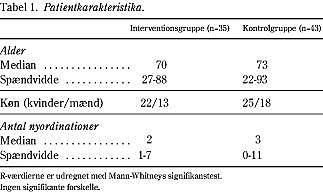 I alt indgik 78 patienter i undersøgelsen: 35 i interventionsgruppen og 43 i kontrolgruppen. Patientkarakteristika fremgår af Tabel 1.