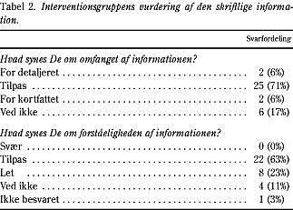 Alle patienter i interventionsgruppen havde fået udleveret en informationsseddel, og 89% (78-99%) havde læst informationen. Treogtres procent (47-79%) af patienterne i interventionsgruppen havde før læst skriftlig information om deres medicin, og 94% (87-100%) fandt, at skriftlig information om lægemidler var en god idé. For kontrolgruppen gjaldt det, at 63% (48-77%) mente, at de ville have glæde af skriftlig information om deres medicin. Samlet var 77% (68-86%) positivt indstillet over for skriftlig information om lægemidler. Patienternes vurdering af informationssedlerne fremgår af Tabel 2.