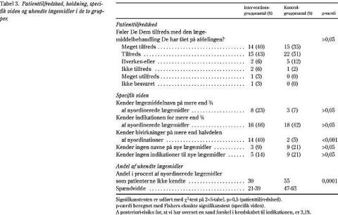 Tilfredshed med behandlingen var ens i de to grupper, og hovedparten af patienterne var enten »meget tilfredse« eller »tilfredse«. Seksogfyrre procent af interventionsgruppen kunne redegøre for indikationen for mere end tre fjerdedele af deres lægemidler mod 42% i kontrolgruppen (NS). I kontrolgruppen kunne 21% ikke nævne navn eller indikation på et eneste af deres nyordinerede lægemidler, og samlet var 55% af de nyordinerede lægemidler totalt ukendte for patienterne i kontrolgruppen, mod 30% i interventionsgruppen (p<0,001).