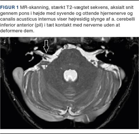 MR-skanning af hjernen samt specialoptagelse af syvende og ottende hjernenerve og porus acusticus internus viste på højre side en tæt kontakt mellem en slynge af a. cerebelli inferior anterior (AICA-slynge) og syvende og ottende hjernenerve (se Figur 1).