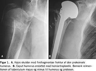 Talrige undersøgelser har vist, at resultatet efter skulderartroplastik er bedst hos yngre patienter med god knoglekvalitet, som akut eller subakut (inden for 2-3 uger) får indsat en artroplastik på grund af skulderfraktur. Hos disse patienter kan man forvente en høj grad af smertefrihed og en rimelig god bevægelighed i skulderen med elevation over 90 grader [2, 4, 6]. Hos patienter med ældre frakturer (> 1-2 mdr.), hvor der er tale om malunion eller caput-nekrose, har flere forfattere fundet et dårligere funktionsresultat, specielt hvis der er manglende tilheling af tuberculum majus [7-11]. Det synes således at være en klar fordel at operere patienter med forskudte tre- og firefragmentær fraktur akut eller subakut, hvis osteosyntese eller konservativ behandling skønnes at være uhensigtsmæssig. Hos langt de fleste frakturpatienter anvendes en hemiartroplastik, hvor den intakte cavitas glenoidalis lades urørt.