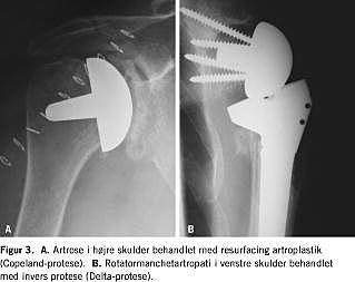 Summary Shoulder arthroplasty Ugeskr Læger 2006;168(19):1841-1844 Every year, almost 500 shoulder arthroplasties are performed in Denmark. About two-thirds are done due to fractures of the proximal humerus. Other common indications are rheumatoid arthritis and primary or secondary arthrosis. The prosthesis is fixed with or without bone cement. If the rotator cuff is lacking, an inverse total arthroplasty can be used, and in arthrosis/arthritis with good bone stock, a resurfacing prosthesis can be used. Good pain relief can be expected, but shoulder movement will usually be permanently inhibited.