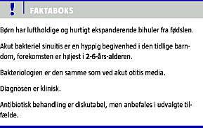 Vi mener, at den akutte sinuitis fortjener mere opmærksomhed i den kliniske hverdag inden for de specialer, der behandler børn med luftvejssygdomme. Det vil bidrage til at forhindre, at tilfælde fejldiagnosticeres som otitis, pharyngitis, pneumoni eller simple virusinfektioner, og det vil dermed spare børnene for fejlslagne behandlingsforsøg.