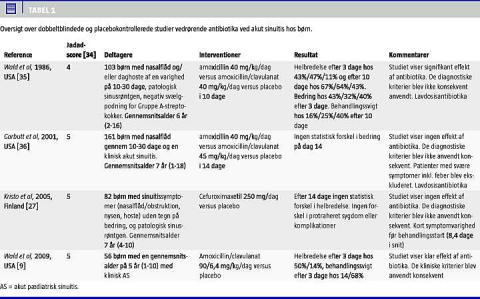 Wald et al [9] inkluderede 56 børn i alderen 1-10 år, som opfyldte mindst et af de kliniske kriterier for AS. De blev randomiseret til enten højdosis-amoxicillin/clavunalat eller placebo. De antibiotikabehandlede børn havde en højsignifikant større forekomst af helbredelse (50% mod 15%, p < 0,001) og lavere forekomst af behandlingssvigt i forhold til placebogruppen (14% mod 68%, p < 0,001). Tabel 1 er en oversigt over de relevante RCT.