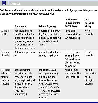 Ud over forskelle i studiedesign kan mikrobiologiske og farmakokinetiske/-dynamiske forhold have medført en underestimering af antibiotikaeffekten. Internationalt er 90% af M. catarrhalis og 13% af nonkapsulate H. influenzae β-laktamase-producerende [18], og i USA - hvor fl ere af behandlingsstudierne er fra - er tallene 100% og 50% [5]. Det betyder, at en del af sinuitiserne ikke har kunnet forventes at respondere i de af studierne, der anvendte amoxicillin. Ydermere er betalaktam-antibiotikas farmakokinetiske/farmakodynamiske drabseffekt tidsafhængig, og god klinisk og bakteriologisk effekt kræver, at koncentrationen af det pågældende antibiotikum i mindst halvdelen af dosisintervallet er over den mindste hæmmende koncentration over for den pågældende bakterie (MIC). Studier med dobbelt paracentese (dvs. før og efter behandling) ved AOM viser, at amoxicillin/clavulanat i høj dosis (90 mg amoxicillin/kg/døgn) har en højere eradikationsrate for både pneumokokker og hæmophilus end samme kombination i lav dosis (40-50 mg amoxicillin/kg/døgn), som igen har en højere eradikationsrate end lavdodisamoxicillin (40-50 mg/kg/døgn) alene [28], og det samme ses ved bihulebetændelse [29]. Se i øvrigt oversigten i Tabel 2 .
