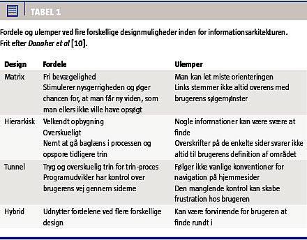 Flere discipliner bidrager til det samlede design af en app: det grafiske design (det visuelle og æstetiske udtryk), det navigationsmæssige design (hvordan brugeren kommer rundt) og endelig informationsarkitekturen (hvordan og hvornår brugeren får adgang til informationer og opgaver) [11]. I Tabel 1 beskrives fire forskellige designmuligheder inden for informationsarkitekturen.
