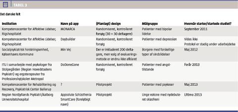 Vi opsporede det danske felt ved at sende mail ud til kolleger og andre i vores netværk samt ringe rundt til alle de institutioner, der kunne tænkes at være i gang med at udvikle eller teste en app til psykiatriske patienter. Alle, der blev opsporet, blev ligeledes bedt om at angive, om de havde kendskab til andre, der arbejdede med apps. Desuden søgte vi i AppStore og Google. Resultatet af søgningen fremgår af Tabel 3.