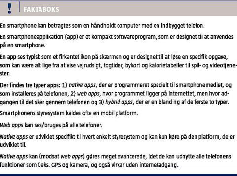 Smartphonemediet er ikke nævnt i regeringens handleplan, men da det kombinerer computerens og telefonens egenskaber, er der grund til at tro, at de samme positive effekter vil kunne opnås ved brug af dette. Formålet med denne artikel er at belyse muligheder og teoretiske overvejelser ved brug af smartphone-apps i den psykiatriske behandling og at give en oversigt over de foreløbige erfaringer. Herudover beskrives, hvilke tiltag der i øjeblikket er i gang på dette felt i Danmark.