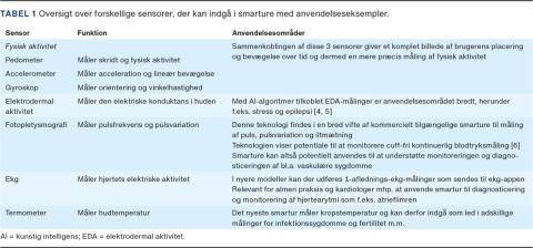 De fleste smarture indeholder forskellige sensorer fra simple pedometre til flerakseaccelerometre og gyroskoper, der alle hjælper til analyse af blandt andet bevægemønster og aktivitet (se Tabel 1). Derudover har flere smarture sensorer, der med refleksiv fotopletysmografi måler pulsation via en optisk målemetode, der kvantiterer volumetrisk variation i blodvolumen som udtryk for pulsen. Flere smarture måler desuden brugerens stressniveau med enten elektrodermal aktivitet – som mål for aktivitet i det sympatiske nervesystem og dermed for stressniveau [4] – eller pulsvariation. Der findes nu smarture, der ved hjælp af machine learning måler variation i pulsationen og ved analyse af denne kan give et ret præcist tal for blodtrykket, uden cuff naturligvis [6]. Tillige kan flere smarture måle blodets iltmætning og kropstemperaturen. Mulighederne er mange, og i studier er det antydet, at smarture kan anvendes til at motivere brugeren til bevægelse og aktivitet [7].