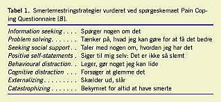 Mestring kan vurderes ved selvrapportering på spørgeskemaer. Vi har anvendt den udbredte Reids The Pain Coping Questionnaire (PCQ) og valideret den på raske danske børn [8]. Eksempler på strategier kunne være følgende: Børnene skulle afslutte udsagnet: »Når jeg har ondt ...« 1) spørger jeg nogen om det, 2) tænker jeg på, at det gør ondt, og undersøger, hvad jeg kan gøre ved det, 3) taler jeg med en ven om, hvordan jeg har det, 4) siger jeg til mig selv: »Lad være med at bekymre dig, det skal nok gå over.«