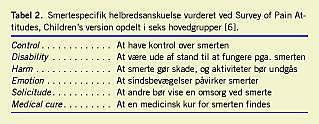 PCQ består af otte mestringsgrupper ud fra 39 strategier, som børn måtte anvende, hvis de fik smerter over nogle timer eller dage (Tabel 1 ). En børnetilpasset version af Survey of Pain Attitudes (SOPA-C) blev anvendt for at undersøge smerterelaterede helbredsanskuelser, som influerer på de måder, hvorpå patienter med kronisk smerte opfatter smerte [6]. SOPA-C består af seks hovedgrupper ud fra 52 smerterelaterede anskuelser, som børn måtte anvende (Tabel 2 ). På en fempunkts Likert-skala blev børnene anmodet om for begge skemaer at graduere, hvor ofte de anvendte den pågældende strategi.
