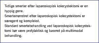 I det følgende gives en kort karakteristik af smertemønstret efter laparoskopisk kolecystektomi. På baggrund af en kritisk procedurespecifik analyse af engelsksprogede randomiserede undersøgelser (systematisk litteratursøgning Pubmed 1985-november 2004) foreslås et multimodalt profylaktisk regimen til behandling af tidlige smerter efter laparoskopisk kolecystektomi.