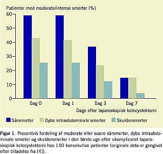 Ætiologien til tidlige smerter efter laparoskopisk kolecystektomi er kompleks og afhænger af både kirurgiske og patientafhængige faktorer og insufficient analgetisk behandling [2, 3]. Der er betydelig variation af smerterne fra patient til patient med hensyn til styrke og varighed, uden at man har kunnet påvise klinisk betydende risikofaktorer for svære postoperative smerter [4]. I den første uge efter laparoskopisk kolecystektomi vil sårsmerter (somatisk smertekomponent) typisk dominere i incidens og intensitet i forhold til dybe intraabdominale smerter (visceral smertekomponent), som igen dominerer over skuldersmerter (formodentlig visceral projektionssmerte) (Figur 1 ). Hos patienter, som ikke får lokalbedøvelse, har ca. 60% moderate eller svære smerter på operationsdagen og den følgende dag (Figur 1). Hos de fleste patienter vil smerterne være ophørt eller væsentligt aftaget inden for de første 3-4 dage, men 10-15% vil opleve moderate eller svære smerter igennem hele den første uge (Figur 1) [4].