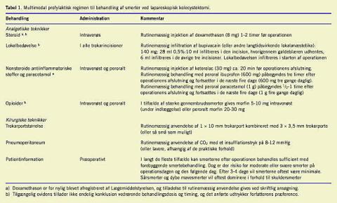 Smertemønstret efter laparoskopisk kolecystektomi med flere forskellige smertekomponenter er komplekst, og ingen unimodale regimener har vist sig at være tilstrækkeligt effektive. Derfor synes profylaktisk multimodal smertebehandling at være attraktivt ved laparoskopisk kolecystektomi, men det optimale regimen er ikke undersøgt i et kontrolleret design. Baseret på den tilgængelige evidens foreslås et multimodalt regimen, som inkluderer rutinemæssig præoperativ smerteinformation, præoperativ anvendelse af steroid, anvendelse af mindre trokarporte, lavere insufflationstryk og peroperativt anvendelse af lokalbedøvelse i portincisionerne og behandling med NSAIDs eller COX2 -inhibitorer i kombination med paracetamol i de første dage efter operationen (Tabel 1). Fremtidige undersøgelser må vise om tillæg af andre analgetika (gabapentin, klonidin og ketamin) yderligere kan forbedre smertebehandlingen ved laparoskopisk kolecystektomi.