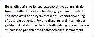 Osteoporotiske frakturer i columna opstået spontant eller ved mindre traumer er hyppige. Den traditionelle smertebehandling består af analgetika, aflastning og fysioterapi. Perkutan injektion af knoglecement i en kollaberet vertebra, vertebroplastik (PVP), er en metode, der i Danmark først for nylig er taget i anvendelse til behandling af smerter ved osteoporotiske columnafrakturer. Effekten af de traditionelt anvendte analgetika, nemlig paracetamol, nonsteroide antiinflammatoriske stoffer (NSAID), codein, tramadol og morfin synes ikke at være undersøgt hos denne patientgruppe. Effekten af PVP er undersøgt i retrospektive og prospektive opgørelser, men kontrollerede randomiserede studier mangler. Det er velkendt, at bisfosfonater kan reducerer knoglesmerter, men om det også er tilfældet ved osteoporotiske frakturer er ikke tilstrækkeligt belyst. Der er veldokumenteret effekt af calcitonin til behandling af akutte smerter ved osteoporotiske vertebrale frakturer. Effekten af fysisk træning er ringe dokumenteret.