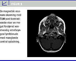 På mistanke om cervikal spondylodiscitis blev der bestilt knogleskintigrafi, og efter to gange bloddyrkning blev der påbegyndt behandling med penicillin og dicloxacillin givet intravenøst. Skintigrafien viste intet unormalt, hvorfor man supplerede med magnetisk resonans-skanning af cervikalcolumna. På skanningsbilledet sås en stor venstresidig RPA i en lymfeknude på 3,0 × 2,5 × 1,5 cm, der strakte sig fra basis cranii til C2 (Figur 1 ) med konveks indbuling i venstre side af oropharynx. Der blev ikke fundet ikke tegn til discitis. Begge bloddyrkninger var uden vækst.
