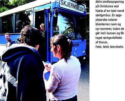 I københavnsområdet undersøges udsatte befolkningsgrupper en gang årligt med røntgenundersøgelse af thorax. Lungemedicinsk Afdeling, Gentofte Hospital, står for undersøgelsen, der foregår i en lejet norsk røntgenbus, som kører rundt til steder, hvor der tidligere har været høj forekomst af tb, eller hvor der kommer personer med høj risiko. I 2010 besøgte bussen Christiania, Kofoeds Skole, Mændenes Hjem i Lille Istedgade, Mozarts Plads og Herberget Hillerødgade. Der blev undersøgt ca. 1.100 personer og fundet ni tilfælde af aktiv tb, heraf otte grønlændere og en indfødt dansker. Det afspejler den stigning i antallet af tb-tilfælde, som er set blandt herboende grønlændere i de senere år, og som vil være hovedindsatsområdet i de kommende år [9].