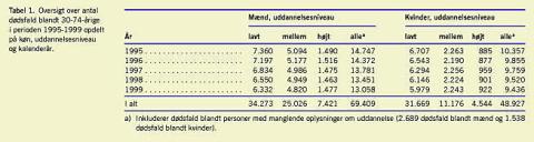 Materiale og metoder: Undersøgelsen er baseret på oplysninger om uddannelse og dødelighed i perioden 1995-1999 og omfatter samtlige dødsfald blandt danskere i alderen 30-74 år. Totale og årsagsspecifikke samt køns- og aldersopdelte dødsrater for hvert af tre uddannelsesniveauer blev beregnet og aldersstandardiseret med henblik på sammenlignelighed over tid og mellem grupper.