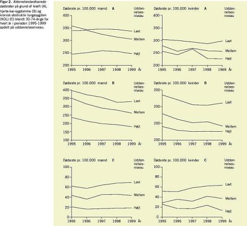Resultater: Den aldersstandardiserede dødsrate faldt årligt med 2,3% for mænd og 1,2% for kvinder med lavt uddannelsesniveau. Faldet var større blandt dem med mellem eller højt uddannelsesniveau, hvor dødsraten i gennemsnit faldt med 4% for mænd og 3,5% for kvinder. Udviklingen i kræftdødelighed viste et fald blandt mænd og kvinder med en uddannelse på mellemniveau og blandt kvinder med et højt uddannelsesniveau, men ikke blandt mænd med højt uddannelsesniveau eller mænd og kvinder med lavt uddannelsesniveau. Dødelighed på grund af hjerte-kar-sygdomme faldt i alle grupper, men mindst blandt de lavtuddannede. Dødeligheden af kronisk obstruktiv lungesygdom steg blandt de lavtuddannede og blandt kvinder med en uddannelse på mellemniveau; i de øvrige grupper var der ingen nævneværdige ændringer.