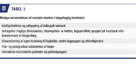 uddannelse og kontakt med patientpopulationer (Tabel 1). I denne artikel vil lægers brug af SM i fagligt øjemed og sociale mediers betydning for videnskabens udvikling blive gennemgået med det formål at introducere læseren for SM i en lægefaglig kontekst.