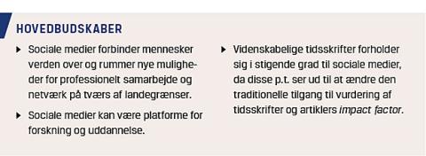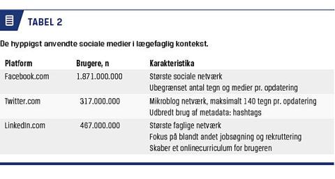 Sociale medier (SM) er computermedierede teknologier, der giver brugeren mulighed for at dele meninger, billeder, videoer og andet elektronisk indhold via internettet. De senere års teknologiske udvikling har medført en rapid stigning dels i antallet af tilgængelige sociale medier, dels i antallet af brugere. P.t. er 2 mia. mennesker verden over forbundet via SM, og det estimeres, at dette tal vil være steget til 3 mia. i 2020 [1]. SM er gratis at benytte og har åbnet for nye måder at være forbundet på verden over, ikke blot private og kulturelle forbindelser, men også faglige og videnskabelige inden for forskellige discipliner. For læger tilbyder SM således nye muligheder for at udvide det faglige netværk nationalt og internationalt, samtidig med at