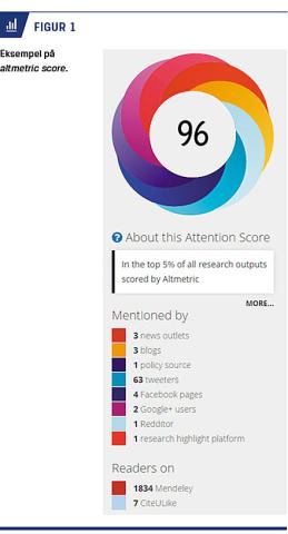 andet rapportere de enkelte artiklers altmetric score (stammer fra alternative metrics), som er et udtryk for, hvor hyppigt en artikel er nævnt og delt på SM (Figur 1). Altmetric score hævdes at være et bedre udtryk for en artikels impact end antallet af citeringer, da omtalen på SM måske i højere grad afspejler antallet af læsere og kollegaer, der er interesserede i den givne artikel [27]. Det er påvist, at der er en signifikant sammenhæng mellem en artikels altmetric score og antallet af citeringer, hvorfor tidsskrifter med høj aktivitet på SM muligvis kan opleve en øgning i antallet af ikke blot læsere, men også på længere sigt antallet af citerede artikler af høj kvalitet [28]. En sidste og ikke uvæsentlig fordel ved altmetric score er, at dette tal opdateres dagligt og således ikke er afhængigt af de (ofte) flere års ventetid, før citerende studier har været igennem den traditionelle peer review-proces og publiceres.