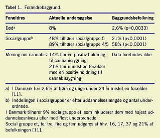 8% havde mistet en forælder, sammenholdt med baggrundsbefolkningen hvor 2,6% af børn og unge under 24 år har mistet en forælder (p=0,0033). 48% var fra socialgruppe fem, 89% var fra socialgruppe fire eller fem, hvorimod 21% af baggrundsbefolkningen er fra socialgruppe fem (p< 0,0001), og 58% er fra socialgruppe fire eller fem (p< 0,0001). 21% havde mindst en forælder med positiv holdning til cannabis (Tabel 1 ). 61% havde mindst en forælder, der var misbruger. 52% havde mindst en forælder, der misbrugte alkohol, 26% havde mindst en forælder, der misbrugte cannabis, piller eller stoffer. Hos 17% var begge forældre misbrugere.
