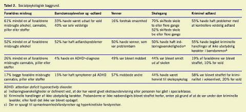 33% havde været udsat for vold, 40% havde selv været voldelige. 52% havde haft adfærdsvanskeligheder (defineret som vedvarende problemer med at tilpasse sig gældende regler). 4% havde en ADHD-diagnose, de angav selv, at de i barndommen var diagnosticeret og behandlet for deficits in attention motor control and perception (DAMP) og 15% har haft symptomer på ADHD. Der blev spurgt til opmærksomhedsforstyrrelser og hyperkinetiske forstyrrelser.