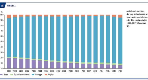 Rygning er fundet at være en stærk mediator i alle sammenhænge mellem dårlig uddannelse og dårligt graviditetsudfald. Sundhedsstyrelsen har siden 1998 anbefalet, at gravide tilbydes hjælp til rygestop [1]. Andelen af gravide rygere er glædeligt faldet gennem de seneste to årtier til 6,1% i 2017, men andelen af kvinder, der ophører med at ryge i graviditeten, har stort set været uændret gennem de seneste ti år (Figur 1) [6]. Ophør med rygning i første trimester af graviditeten reducerer risikoen for dødfødsel, præterm fødsel og lav fødselsvægt til niveauet for ikkerygere [20, 25]. I flere regioner er gravide rygere henvist til kommunale tilbud, der ikke er specielt designet til denne målgruppe, og det er således uvist, om de anvendes og virker. En forebyggende indsats over for rygning iværksættes mest hensigtsmæssigt prækonceptionelt og ved at forebygge rygestart blandt unge.