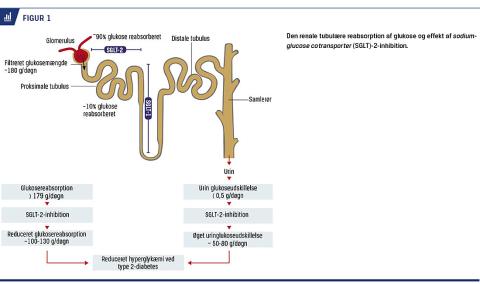 Nyrerne filtrerer ca. 180 l plasma i døgnet, hvilket svarer til ca. 180 g glukose filtreret pr. døgn. Ved normoglykæmi reabsorberes den filtrerede glukose (sammen med natrium) til blodet via to glukosetransportører, SGLT-2 og SGLT-1 i nefronets proksimale tubuli [7]. SGLT-2 er lokaliseret i første del af de proksimale tubuli og absorberer 80-90% af den samlede glukosemængde. SGLT-1 findes distalt i de proksimale tubuli og absorberer de sidste 10-20% (Figur 1). Man mener, at SGLT-2 primært findes i nyrerne, mens SGLT-1 også findes i tyndtarmen, hjertet og lungerne [7]. I tyndtarmen sørger SGLT-1 for hovedparten af absorption af glukose og galaktose til blodet. Hos glukosetolerante individer overskrides den maksimale glukosereabsorption i nyrerne ikke, i modsætning til hos hyperglykæmiske patienter med diabetes. Ved plasmaglukoseværdier over ca. 10 mmol/l overskrides SGLT-2’s og SGLT-1’s kapacitet, og resultatet er glukosuri. Længerevarende hyperglykæmi medfører opregulering af SGLT-2 og dermed en forøgelse af tærskelværdien for glukosereabsorption [8]. Dette er en reversibel effekt, idet