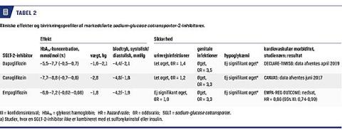 De kliniske effekter fremgår af Tabel 2. For alle tre stoffer ses der relevante kliniske effekter på HbA1c i monoterapi og ved tillægsbehandling til metformin, dipeptidylpeptidase 4-inhibitor (DPP-4i), SU og insulin. Dette gælder for dapagliflozin 10 mg dagligt i monoterapi [17, 18] og som tillægsbehandling [18]. I monoterapi er dapagliflozin fundet at have samme effekt på HbA1c som metformin [19] og glipizid (SU) i tillæg til metformin [20]. Canagliflozin 100 mg og 300 mg dagligt er undersøgt i monoterapi eller som tillæg til metformin eller metformin + SU [13]. I enkelte studier er canagliflozin 300 mg dagligt fundet at være signifikant mere effektivt end SU [21] eller DPP-4i [22]. Effekten af empagliflozin er beskrevet i en metaanalyse [23]. I studier, hvor empagliflozin 10 mg dagligt er sammenlignet med behandling med metformin, SU eller DPP-4i fandtes en ligeværdig effekt på HbA1c, mens empagliflozin 25 mg dagligt var signifikant mere effektivt end SU og DPP-4i [24]. En vedvarende effekt for stofferne er set i studier af 1-4 års varighed [13, 24, 25]. Resultaterne af en netværksmetaanalyse tyder på, at canagliflozin muligvis har en lidt større effekt på HbA1c end dapagliflozin og empagliflozin (estimeret forskel i HbA1c på 0,2%) [26].