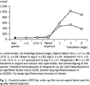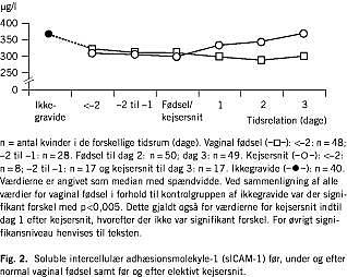 Resultater: CRP var lidt forhøjet i slutningen af graviditet (median: 50 nmol/l, spændvidde: 50-329) sammenlignet med hos den ikkegravide kontrolgruppe (50 nmol/l, spændvidde: 50-158), p < 0,05. CRP steg ved aktiv fødsel fra 50 nmol/l (spændvidde: 50-329) til 91 nmol/l (spændvidde: 50-440), p < 0,0001 og nåede på andendagen en værdi på 529 nmol/l (spændvidde: 174-1.161). En større stigning blev observeret efter kejsersnit, nemlig fra 50 nmol/l (spændvidde: 50-253) til 1.027 nmol/l (spændvidde: 699-1.832), p < 0,0001. sICAM-1 var lavere i slutningen af graviditeten (323 μ g/l, spændvidde: 149-580) end hos kontrolgruppen (366 μ g/l, spændvidde: 160-650), p < 0,005. sICAM-1 var stort set uændret i løbet af graviditet til terminen, vaginal fødsel og i puerperiet. Efter kejsersnit steg sICAM-1 fra 300 μ g/l (spændvidde: 187-370) til 370 μ g/l (spændvidde: 241-490), p < 0,001, svarende til hos den ikkegravide kontrolgruppe.