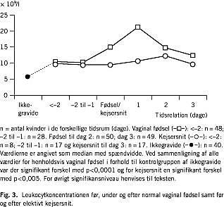 Leukocyttallet var forhøjet i slutningen af graviditen, 10,5 × 109 /l (6,9-18,6) sammenlignet med hos den ikkegravide kontrolgruppe, 5,8 × 109 /l (3,0-8,7), p < 0,0001. Leukocyttallet steg efter vaginal fødsel med en maksimumværdi dagen efter fødslen på 21,2 × 109 /l (13,1-36,6), hvorefter leukocyttallet faldt. Leukocytstigningen var mindre efter elektivt kejsersnit og nåede maksimumværdi på andendagen, 12,3 × 109 /l (7,8-15,7) (Fig. 3 ).