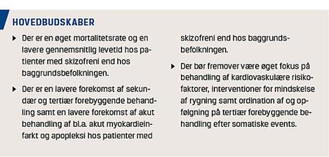 Schizophrenia is associated with an increased mortality rate worldwide. Life expectancy is decreased with 16 and 20 years for females and males in Denmark, respectively, despite of a free and universally accessible healthcare system. Chronic somatic diseases are more common in patients with schizophrenia, but the treatment thereof seems less common in patients than in the background population. Although mandatory screening for cardiovascular risk factors takes place, there seems to be a reduced treatment of dyslipidaemia, hypertension and diabetes in patients diagnosed with schizophrenia.