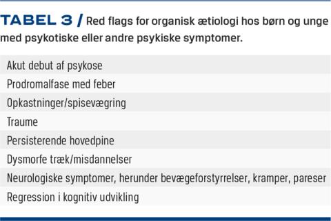 Det kan være vanskeligt at adskille organisk fra ikkeorganisk psykose initialt [22], men debut af vores forslag til red flags (Tabel 3) sammen med psykiske symptomer indikerer, at der bør udredes for organisk ætiologi.